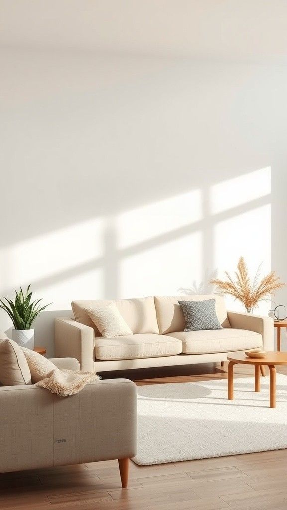 The light tones of the sofas invite natural light, creating a bright and airy feel. Pairing these neutral colors with wooden accents, as seen in the coffee table and flooring, enhances the overall aesthetic, adding warmth and texture to the room. This combination not only looks cozy but also encourages a relaxed environment, perfect for family gatherings or a quiet evening.