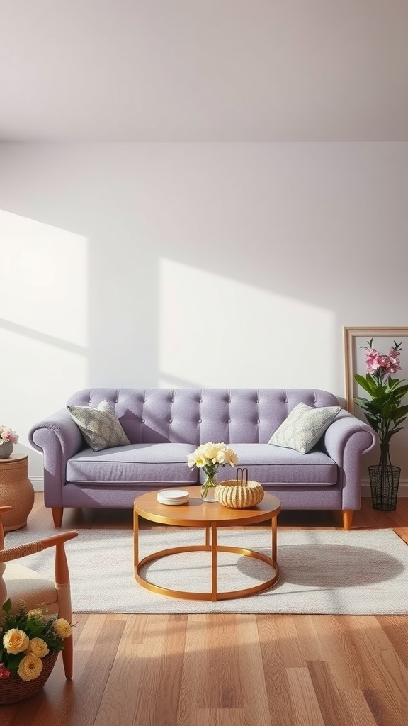 In the image, the lavender tufted sofa serves as a beautiful focal point. It’s paired with light wooden legs that enhance its modern charm. The cushions add a hint of texture, making it not just stylish but also cozy. Surrounding the sofa are cheerful accents, like a round coffee table topped with a simple vase and a cozy pumpkin decoration that invites warmth.