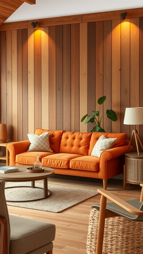 When it comes to choosing sofa colors that evoke warmth and comfort, earthy tones are a fantastic choice. Take a look at the image of the vibrant orange sofa set against a backdrop of rich wooden paneling. The combination creates a inviting atmosphere that’s perfect for relaxing. The natural elements, like the plants and wooden textures, enhance the overall cozy feel of the space.